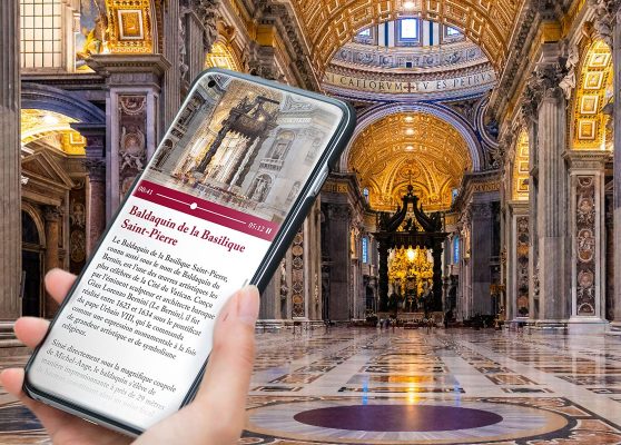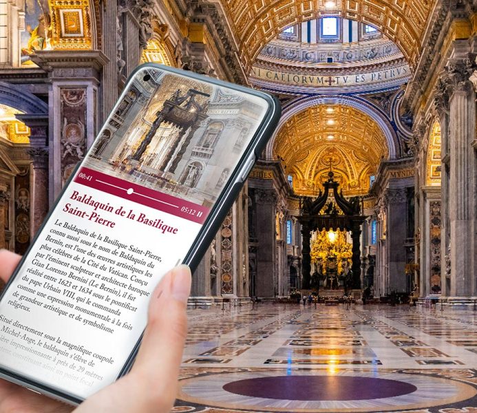 L'application audioguide affichée sur un smartphone, contenant des descriptions détaillées des éléments clés de la basilique, tels que le Baldaquin du Bernin, visible à l'arrière-plan.