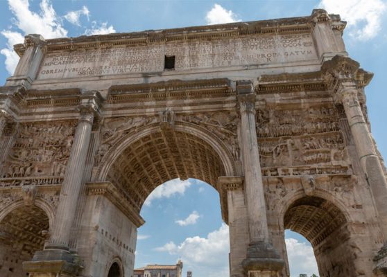 L’arc de triomphe de Septime Sévère a été construit pour commémorer les glorieuses victoires de l’empereur dans les batailles contre les Parthes (Iran, Irak). Erigé dans le Forum romain et presque intact, le monument comporte quatre colonnes par façade qui reposent sur des plinthes ; il a trois arches et 23 mètres de haut, 25 mètres de large, avec une profondeur de 11,20 m. Il a trois entrées : la centrale mesure 12 mètres de haut, l’autre 7,80. Une route passait sûrement au centre.