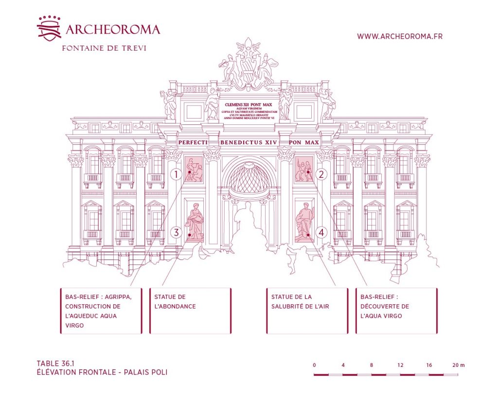 L’élévation frontale du Palais Poli met en valeur les bas-reliefs et les statues qui encadrent la Fontaine de Trevi, soulignant le lien entre architecture et symbolisme. Le premier bas-relief représente Agrippa supervisant la construction de l’aqueduc Aqua Virgo, une merveille d’ingénierie qui alimente encore aujourd’hui la fontaine. Le second bas-relief illustre la découverte de la source de l’Aqua Virgo, inspirée de la légende de son origine. De chaque côté se trouvent deux statues allégoriques : l’Abondance, symbolisant la richesse de l’eau, et la Salubrité de l’Air, emblème de pureté et de bien-être. Ces éléments décoratifs s’harmonisent avec la grandeur de la Fontaine de Trevi, enrichissant sa signification symbolique.