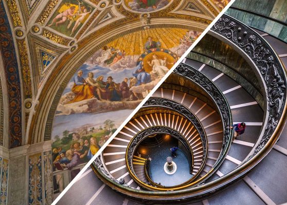 Gauche: les fresques de Raphaël dans les Chambres de Raphaël, affichant des scènes vibrantes du maître de la Renaissance Raphaël qui capturent des thèmes théologiques et philosophiques. Droite: l'incroyable Escalier de Bramante au Musée Pio-Clémentine, célèbre pour son élégant design en spirale.